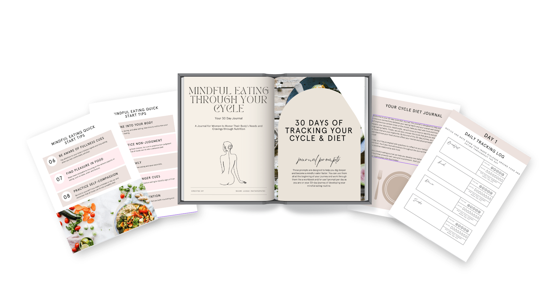 ONE TIME OFFER $12: If you're a woman who's been struggling to eat mindfully and nourish your body in a way that feels aligned with your menstrual cycle, our "Mindful Eating through Your Cycle" journal is here to help. This 30-day journal is designed to help you tap into your body's natural rhythms, honor your cravings, and create a healthy relationship with food that supports your overall well-being. With daily prompts and tracking tools, this journal guides you through the different phases of your cycle and helps you tune into your body's unique needs during each phase. From understanding your hunger cues to practicing self-compassion, this journal provides a holistic approach to mindful eating that goes beyond just counting calories. By the end of the 30 days, you'll have a deeper understanding of your body's needs and a personalized toolkit for nourishing yourself in a way that feels sustainable and intuitive. Whether you're looking to improve your digestion, manage your hormones, or simply feel more connected to your body, "Mindful Eating through Your Cycle" is the perfect companion for your wellness journey. Don't wait to start honoring your body's needs and cravings through nutrition. Get your copy today!